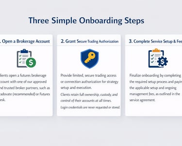 You mirror our fully automated proprietary trading strategies within your own brokerage accounts. Funds remain fully controlled and in custody of the client at all times.